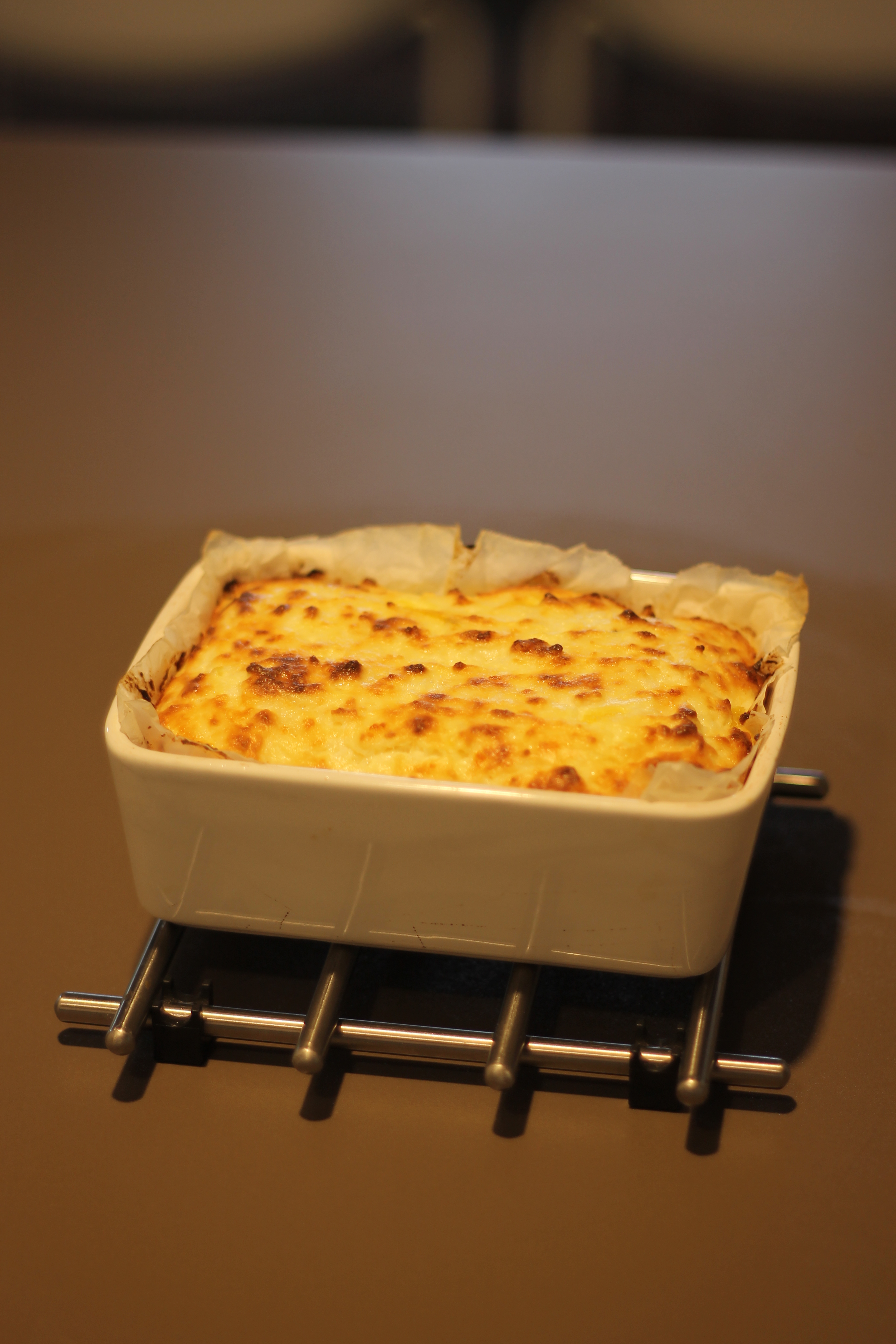 In una ciotola, mescolo tutti gli ingredienti con una forchetta fino a ottenere un impasto cremoso. Verso il contenuto in una terrina ricoperta dalla carta da forno.