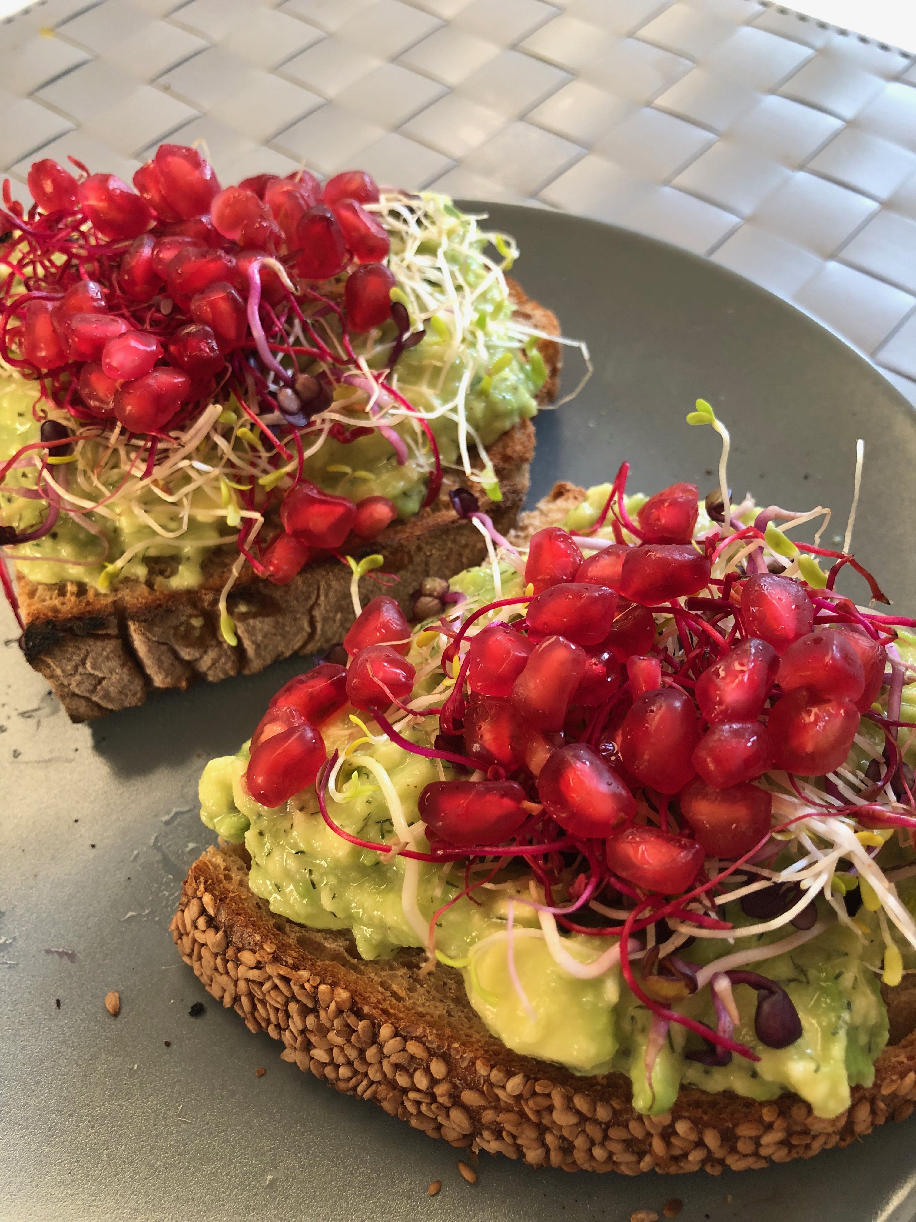 Al contrario della precedente, questa variante è più invernale. Guarnisco il mio avocado toast con germogli misti e melograno, per un carico di vitamine!