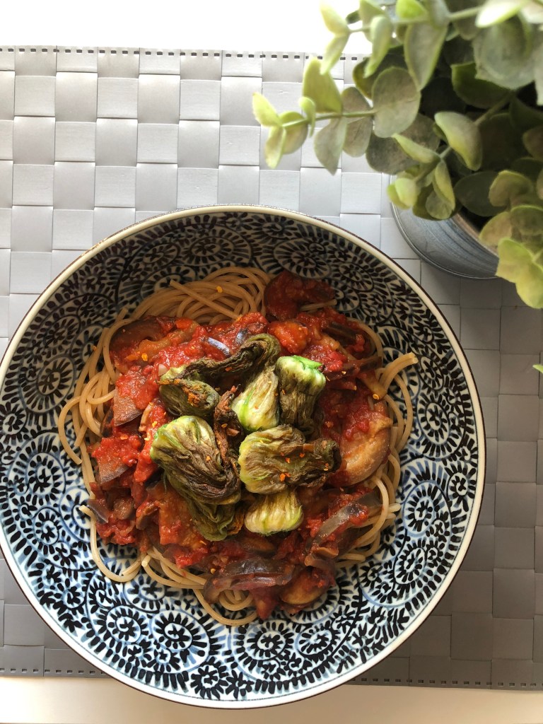 Pasta con le melanzane al sugo e fiori di zucchina saltati