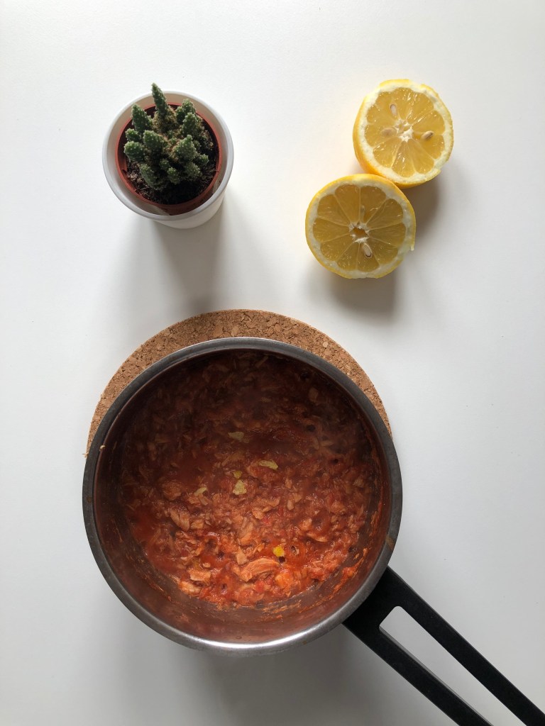 Nel passaggio 1, faccio soffriggere 150 gr di tonno e 50 gr di alici. Una volta scolato il riso, lo verso nella pentola del sugo e faccio asciugare bene l’acqua rimasta.
