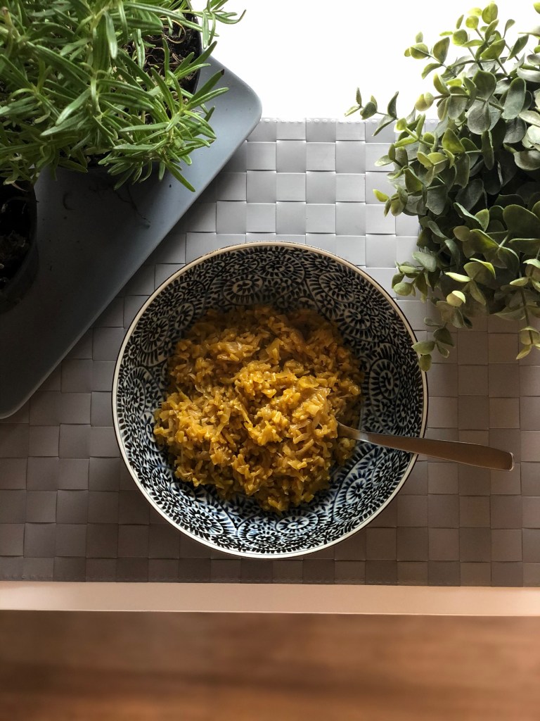 In questa ricetta l’avena non è particolarmente cremosa, ma con i crauti al curry e rosmarino diventa sicuramente un pasto confortevole (e colorato sicuramente con le tonalità autunnali!) e caldo, ottimo da consumare davanti a una bella finestra con vista.