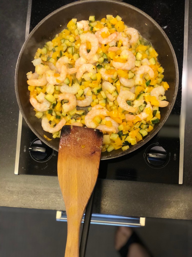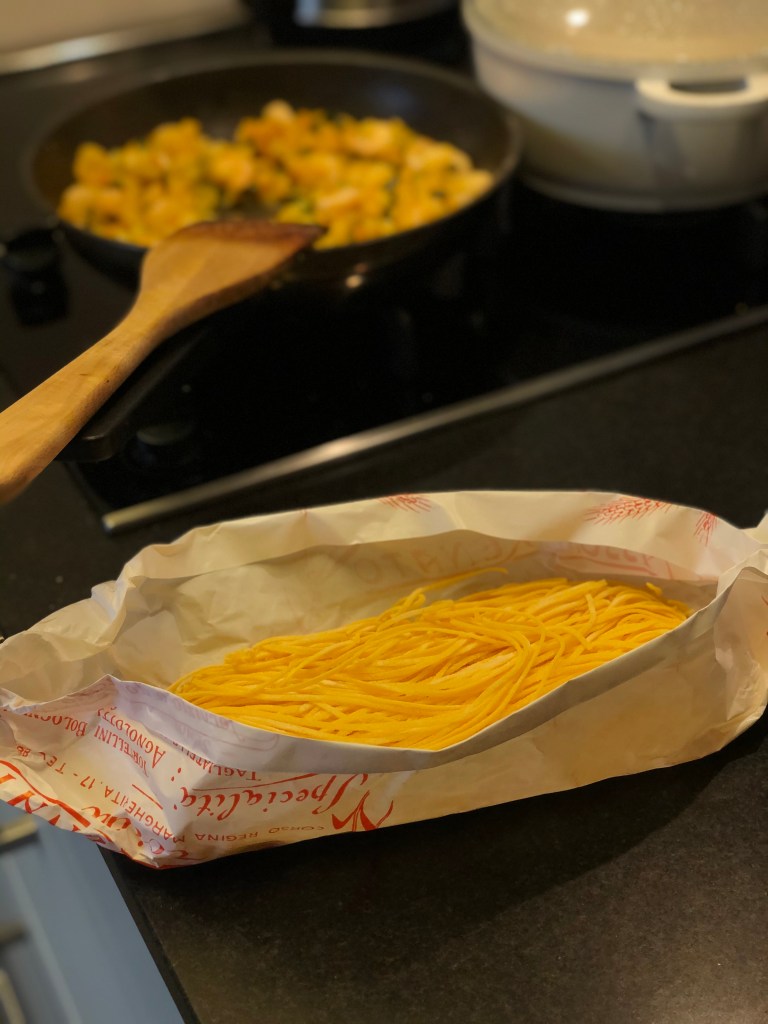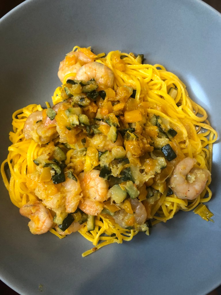 tajarin all’uovo freschi con gamberetti al sugo di peperoni gialli e zucchine