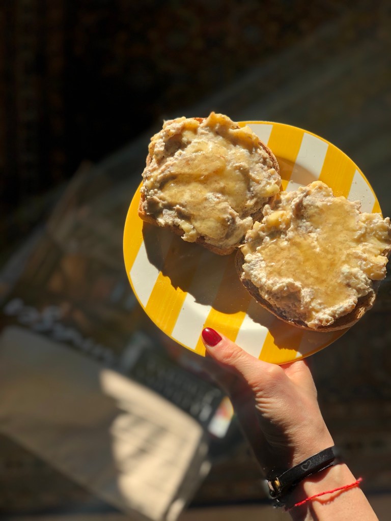 Mentre aspetto che il pane si tosti, schiaccio la banana con una spolverata di cannella e aggiungo la ricotta e le noci. Metto uno strato di crema sul pane e condisco con un cucchiaino di miele.