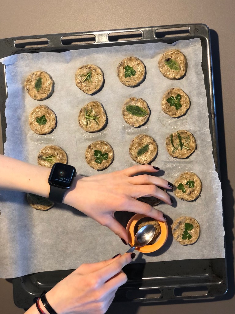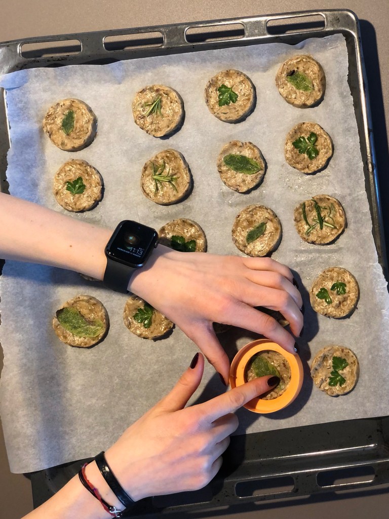 Poi posiziono una fogliolina degli aromi che ho scelto sul biscotto e premo bene in modo che aderisca all’impasto.