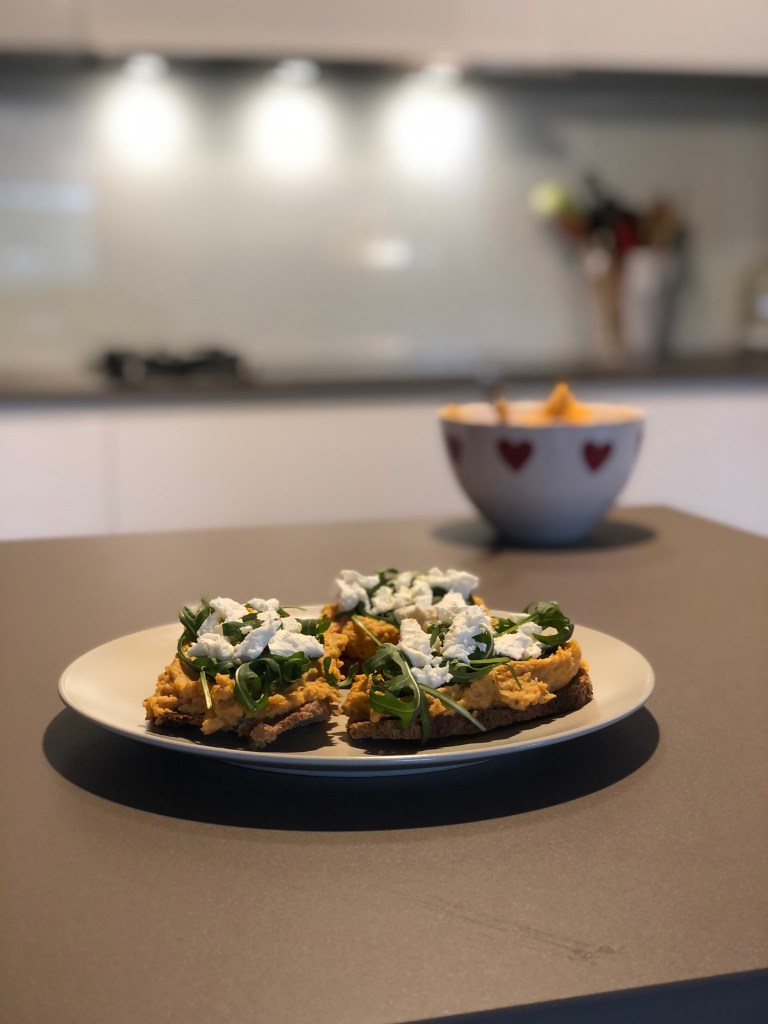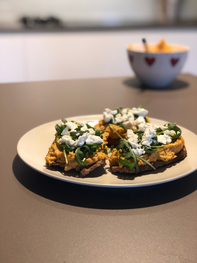 crostoni di pane integrale con hummus di carote alla salvia, feta e rucola