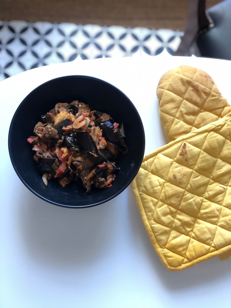 Cuocere le melanzane in forno statico 200ºC per 40/50 minuti, finché la buccia non sarà secca. Toglierle dal forno, lasciarle raffreddare e tagliare a cubetti.