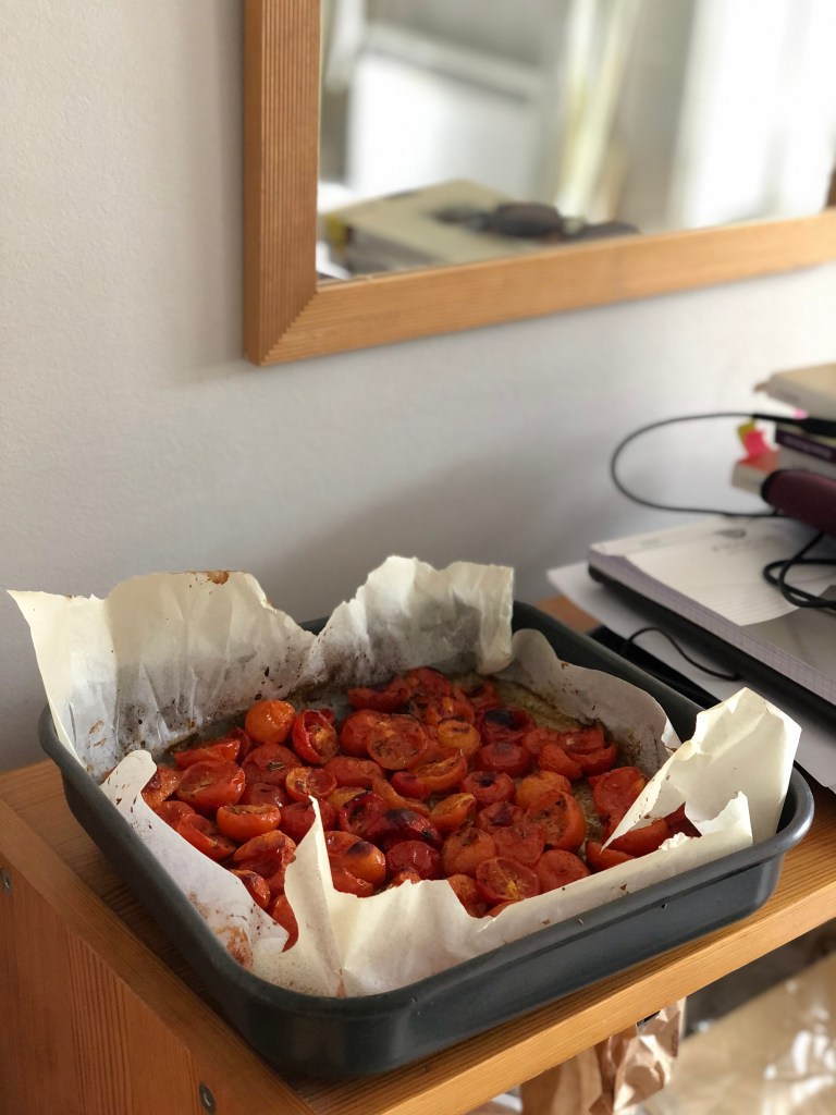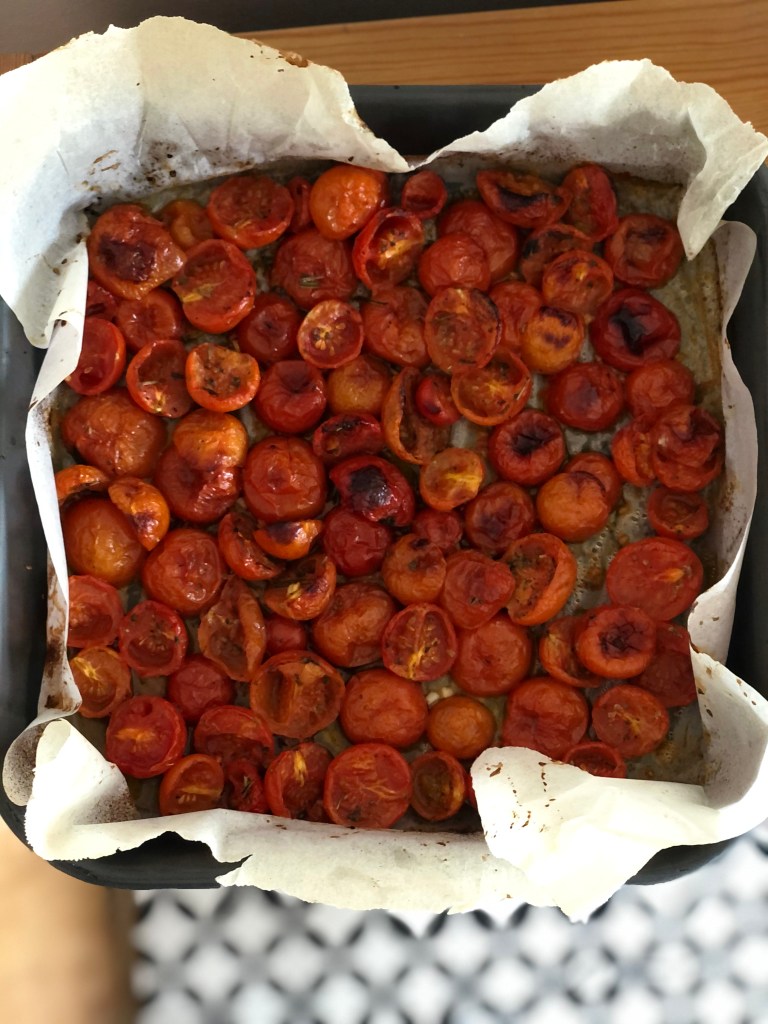 Tagliare i pomodorini a metà, metterli in una teglia e condirli con le scorze di lime, sale, pepe, olio evo, rosmarino, origano e 1 pezzo di aglio tritato. Cuocere a 200°C ventilato per 25-30 minuti.