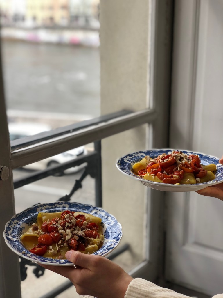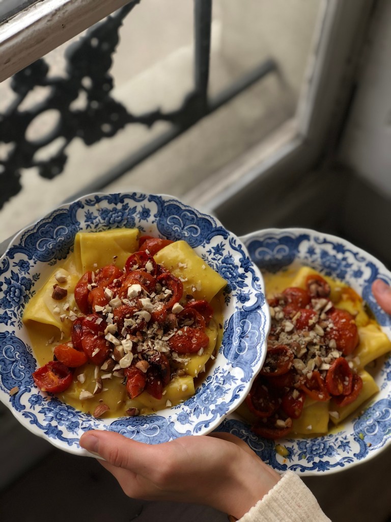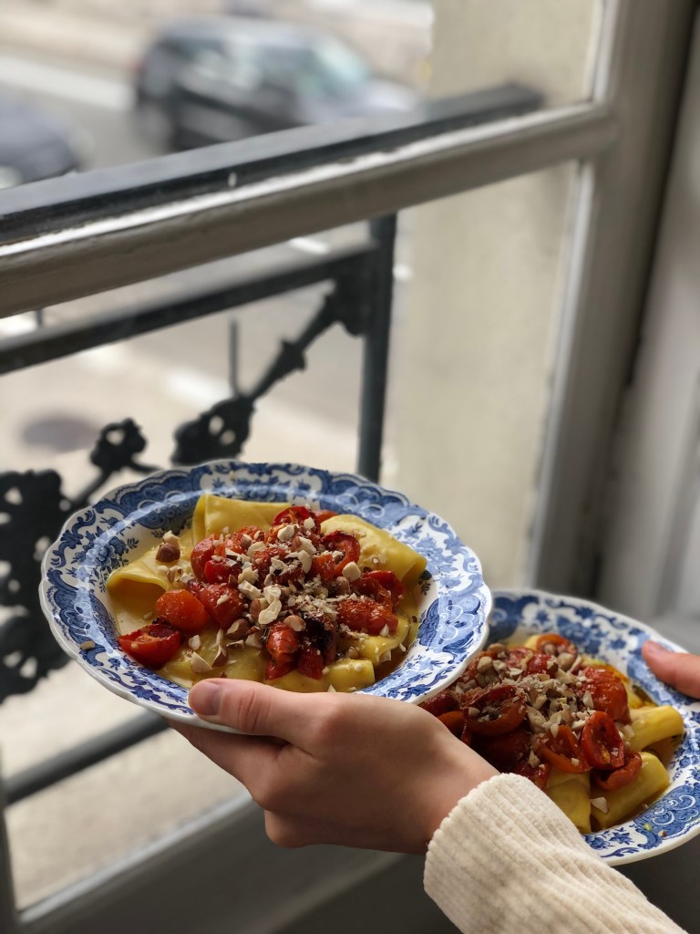 paccheri con besciamella veg alla curcuma, pomodorini confit al lime e granella di nocciole