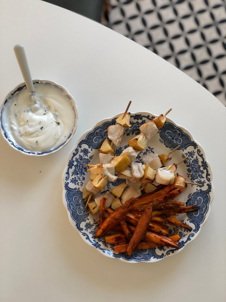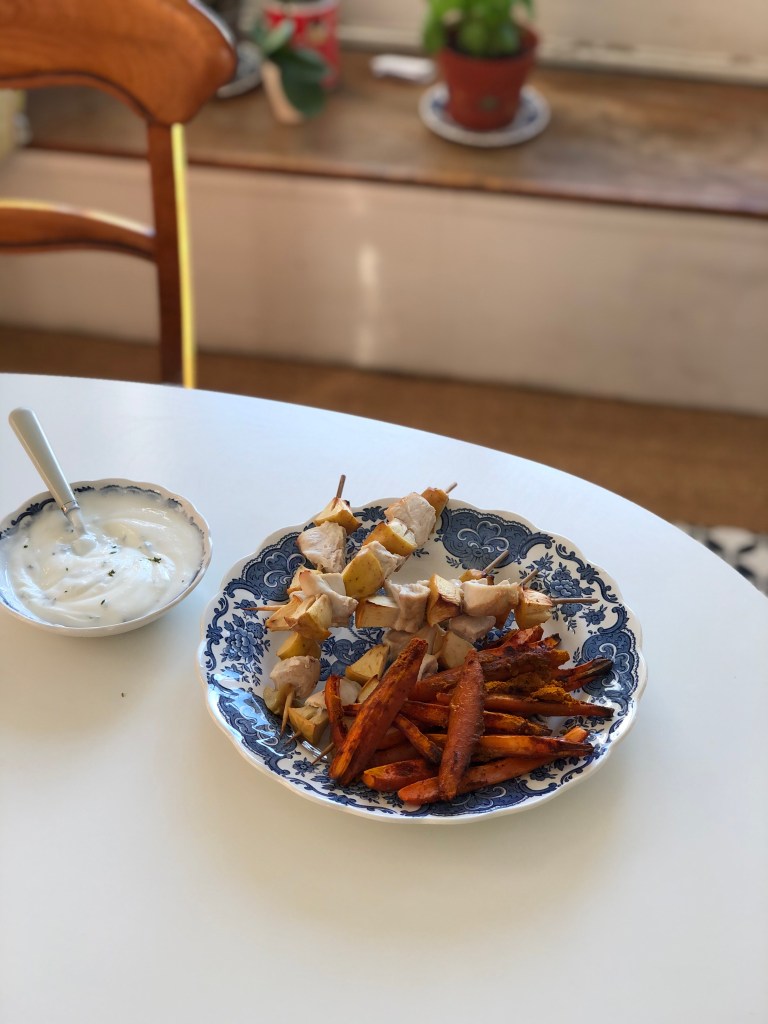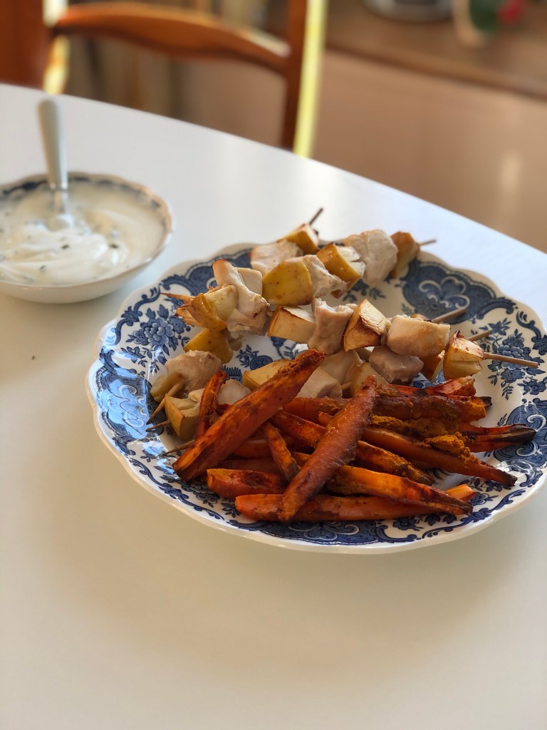 spiedini di pollo e mele con carote alla curcuma e paprika al forno e salsa yogurt al timo, basilico e menta