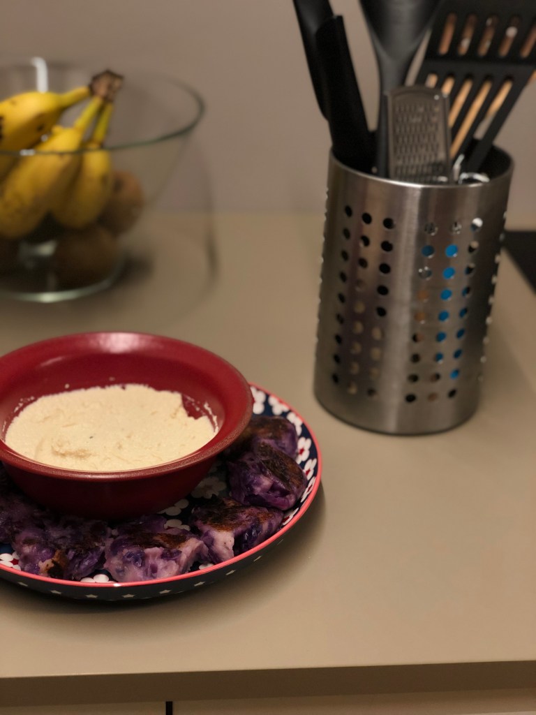 crocchette di patate e cavolo viola vegan con crema di tofu al limone e sale aromatico