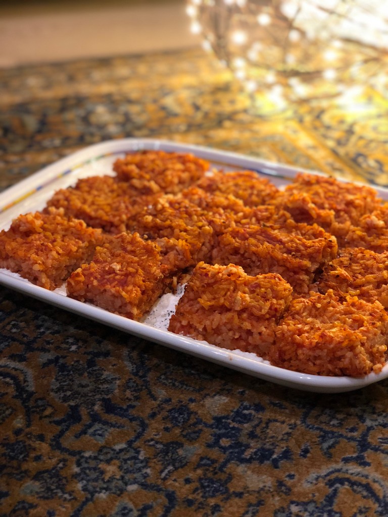 In un piatto da portata spalmate la crema di ricotta e posizionate in superficie i cubotti di riso (da servire tiepidi!).