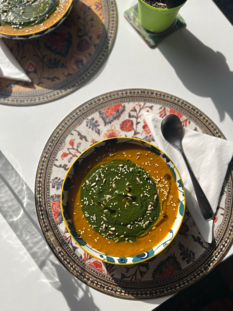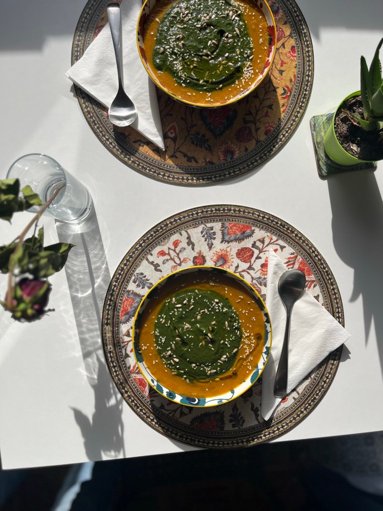 vellutata di zucca alla curcuma e crema di spinaci e ceci allo zenzero