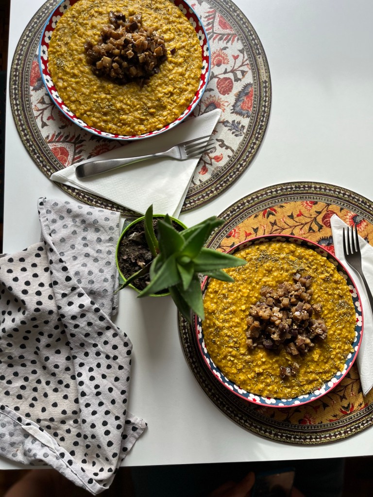 porridge salato alla zucca con dadolata di melanzane marinate con erbe di provenza e aceto di lamponi VDA