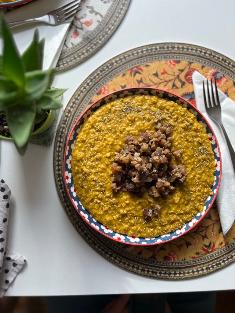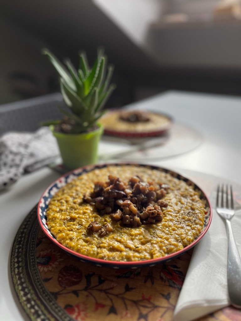 Servite il porridge alla zucca con qualche cucchiaio di dadolata di melanzane marinate! Condite con olio evo.